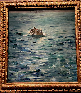 With these photos (which include wall labels and details) I apologize for being too lazy to edit or remove the glare to peak culmination, I show some of the painting gaffes that distracted me. Manet loved to smush out a toe and fingers here and there; Degas would allow a pant leg to be as flat as an ironing board; canvases were literally torn /sliced away from the original works and I believe Manet just got too bored to finish up the less finer point of a piece. Also interestingly Manet was not afraid of using dark tones in even the whitest of draperies, but rarely would he model a person's particularly a woman’s face with darker tones. so some of his greatest depictions of women are very pale and delicate. The exception is a great Berthe Morisot portrait.
